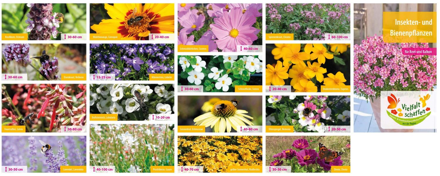 Garten, Terrasse und Balkon sind von Insekten geschätzte Plätze - besonders wenn dort die richtigen Pflanzen vorzufinden sind. Mit einer entsprechenden Bepflanzung werden Bienen und andere Nutzinsekten maßgeblich unterstützt. Der Bienen-Flyer bietet eine Auswahl aus dem riesigen Sortiment der Beet- und Balkonpflanzen, die sich als Insektennahrung bewährt haben.